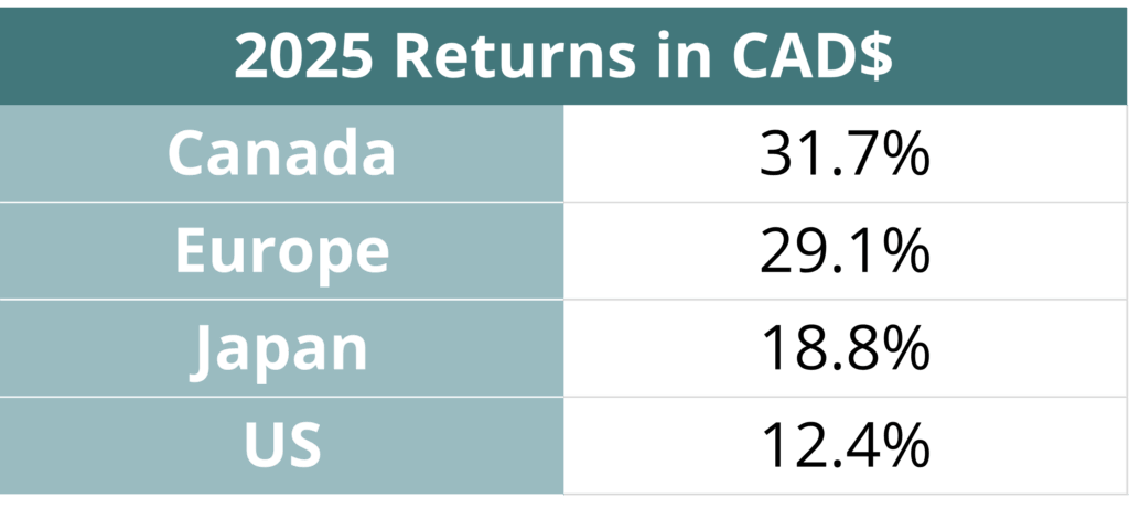 The shift in market leadership away from the U.S. was another meaningful development in the year. Canadian and international markets meaningfully outperformed the S&P 500, led by decidedly ‘old economy’ sectors like financials, industrials and materials, where returns were driven by falling interest rates, AI data centers, defense and stimulus spending and a surge in precious metal prices.