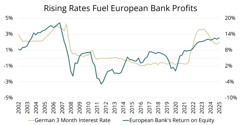 In Europe and Japan, the re-emergence of positive interest rates has re-ignited profitability in the languishing banking sector in recent years. European financials rose 65.7% in 2025 as valuations re-rated upwards alongside higher earnings per share. In Canada, falling central bank rates caused the yield curve to steepen. While the Canadian economy remained tepid, bank stocks rose 43.4%.