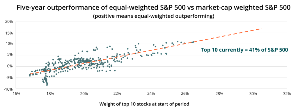 The S&P 500 is now the most concentrated in history, while still trading at a valuation historically associated with weak future returns. As the below chart shows, the more concentrated the index is, the better the average U.S. stock has tended to perform relative to the broader S&P 500.